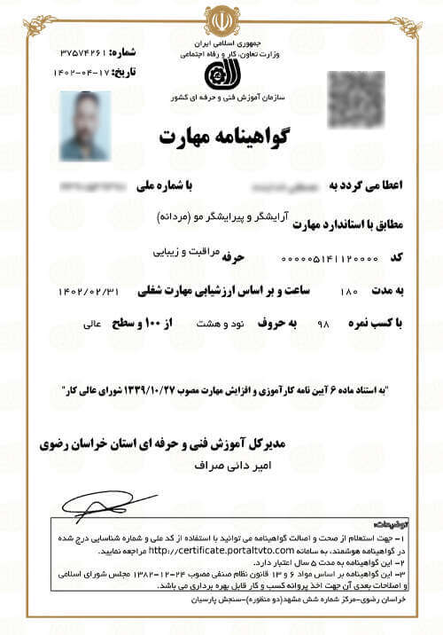 پس از شرکت در دوره آرایشگری سنجش پارسیان شما در آزمون فنی و حرفهای شرکت کرده و در صورت کسب نمره قبولی از آزمونها از سوی سازمان فنی و حرفهای گواهینامه رسمی و قابل ترجمه رسمی را دریافت خواهید کرد.